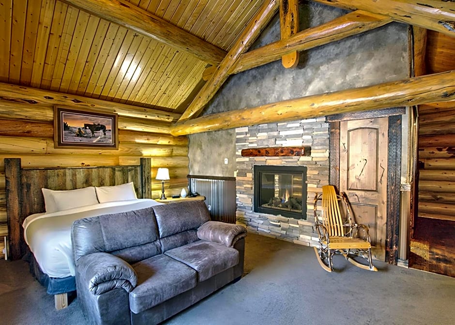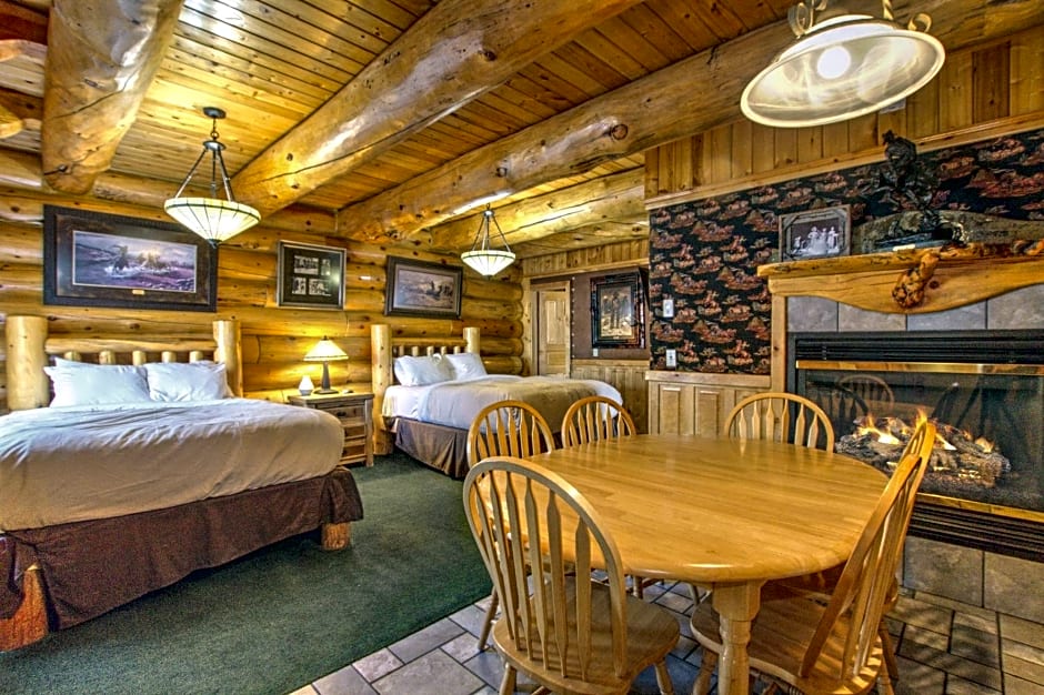 This large, rustically inspired room features a kitchenette, a fireplace, a TV, and a private bathroom with a bath or shower. There is one queen bed in a separate bedroom, and two queen beds in the living room area.
